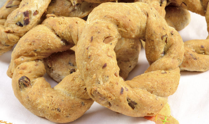 Versate sulla spianatoia a fontana la farina, intanto fate bollire il vino, l’olio e l’acqua con un po’ di sale. Versate sulla farina il preparato ancora bollente e impastate fino ad ottenere un composto piuttosto morbido. Formate dei bastoncini che assottiglierete con il mattarello fino ad ottenere una sfoglia sottile che unirete alle estremità e soffriggerete in abbondante olio caldo. Quando raggiungeranno la giusta doratura, toglieteli dal fuoco e intingeteli nel miele precedentemente riscaldato.