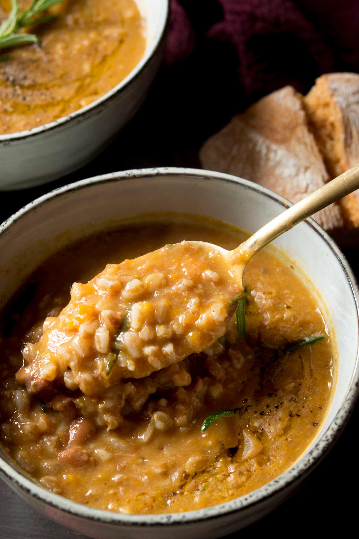 Una zuppa di farro toscana semplice e deliziosa a base di verdure sostanziose, fagioli borlotti (fagioli rossi), pancetta e aglio. È ricca di sapore, super nutriente e perfetta per tenersi a proprio agio durante i mesi più freddi!
