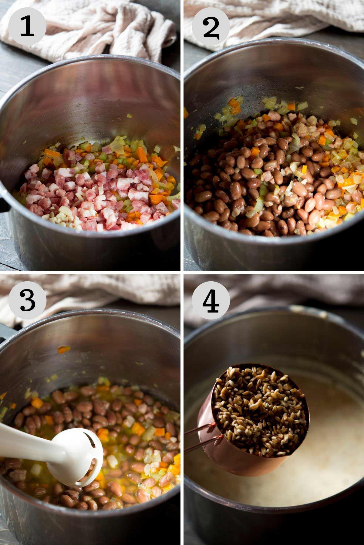 - Sciacquare i fagioli borlotti in scatola (3 tazze/800 g) e aggiungerli alle verdure e alla pancetta con 2 tazze/500 ml di brodo vegetale.